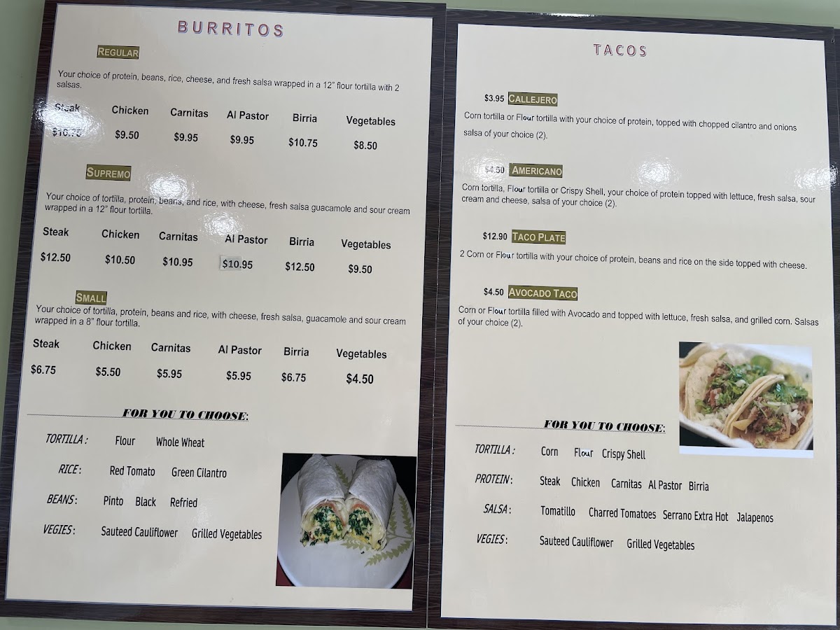 A hearty classic! Your choice of tortilla filled with steak, beans, rice, cheese, fresh salsa, guacamole, and sour cream. Available in supreme, regular, or small sizes. Gluten-Free: Yes, if you choose a gluten-free flour option. Vegan: No. Vegetarian: Yes, if you choose Grilled Vegetables or Sautéed Cauliflower. ESP: ¡Un clásico delicioso! Tu elección de tortilla rellena con carne asada, frijoles, arroz, queso, salsa fresca, guacamole y crema agria. Disponible en tamaños supremo, regular o pequeño. Sin Gluten: Sí, si eliges una opción de harina sin gluten. Vegano: No. Vegetariano: Sí, si eliges vegetales a la parrilla o coliflor salteada.